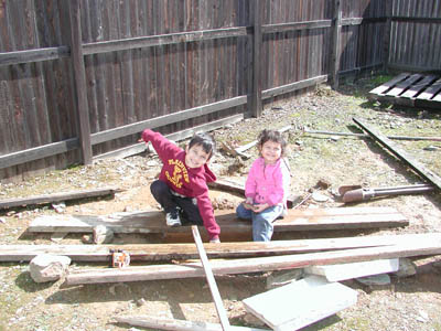 Melina and I are playing in the backyard. It's still a little cold.