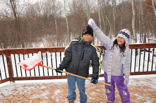 Another winter in Minnesota, and more shoveling. Melina and I helped clean up the deck. Well, I wonder who has the shovel and who's standing around eating snow. Hmmm.